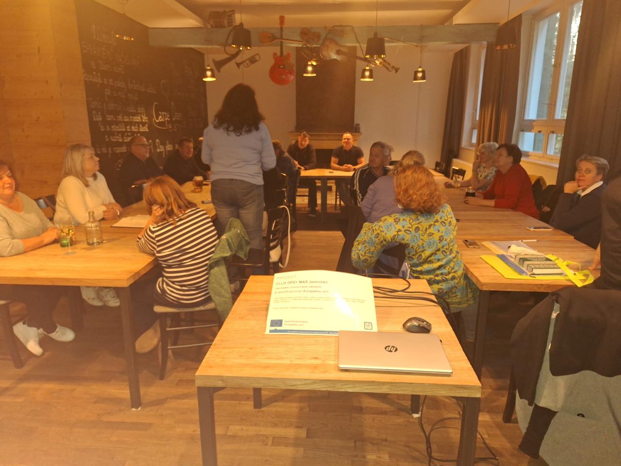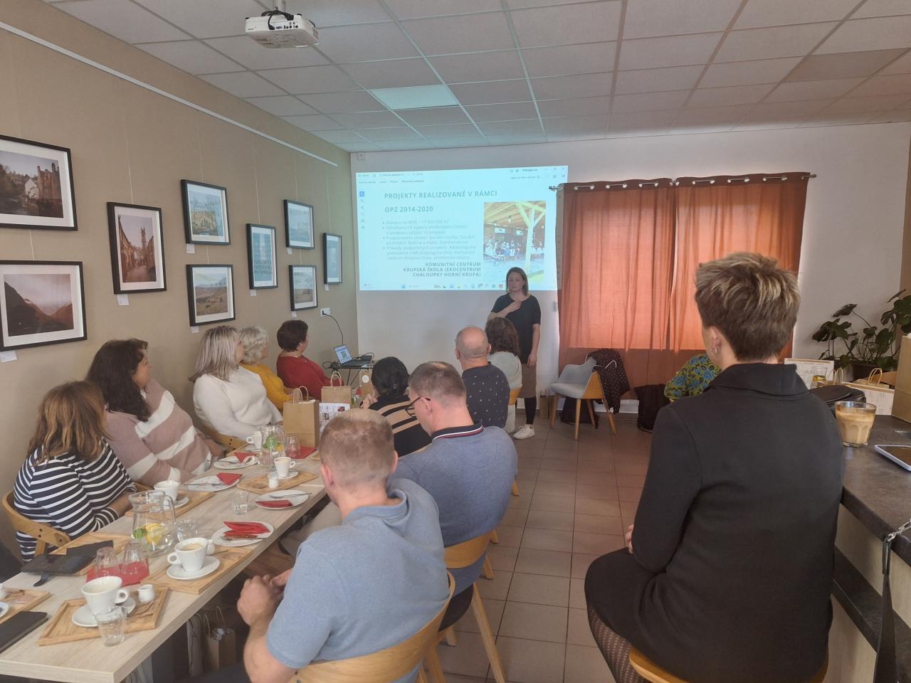 Další zastávkou byla Kavárna na cestě, sociální podnik provozovaný MAS Královská stezka. Místo, kde se potkává vůně kávy, výborné zákusky a smysluplná práce. Kavárna totiž dává pracovní příležitost lidem se zdravotním postižením či jiným znevýhodněním. Zástupci MAS Královská stezka nám zde představili své projekty, úspěchy i nové směry, kterými se ubírají. Zazněla také prezentace naší MAS o projektu OPZ+, jeho výsledcích i navazujících aktivitách, do kterých se obce mohou zapojit.