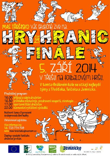 Hry bez hranic - finále v Třešti Dovolujeme si Vás pozvat na finálové kolo Her bez hranic, které se uskuteční v Třešti, dne 5.9.2014 od 16:00 na fotbalovém hřišti. Celkem do finálového kola postoupilo 9 družstev - z každé MAS tři družstva. Připraveny jsou poháry a hodnotné ceny pro soutěžící. Hudba a občerstvení zajištěno. Všichni jste srdečně zváni.